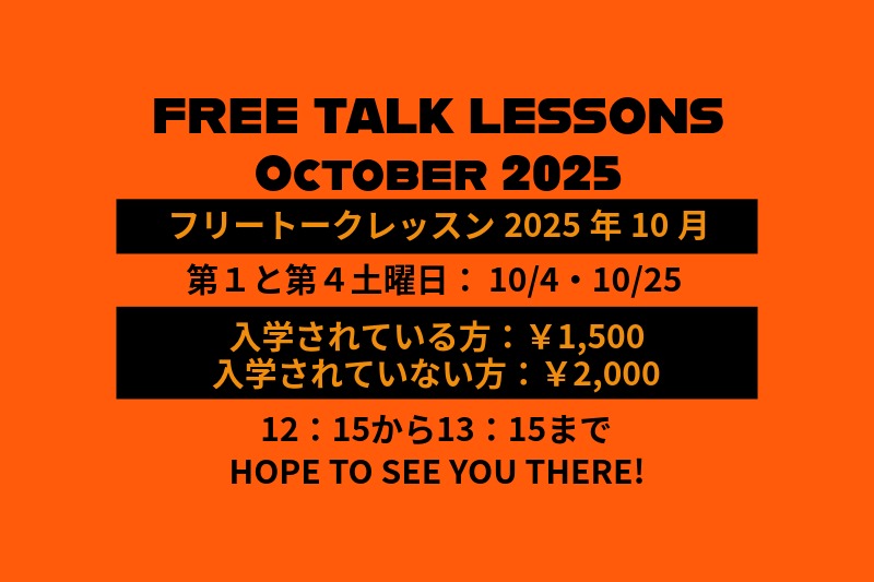 This month Free Talk will be held on Saturday October 4th and October 25th. The lesson starts at 12:15. Hope to see you there!